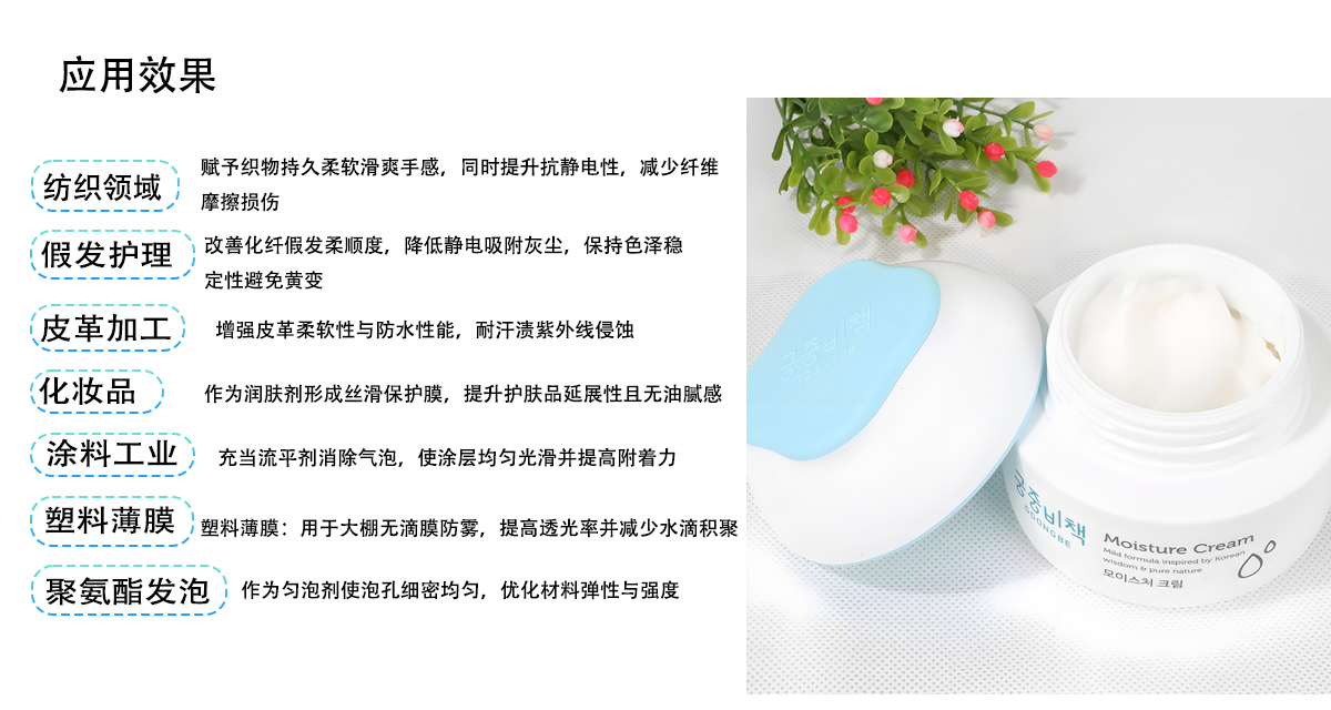 纺织整理;洗发水抗静电;聚氨酯匀泡;合成革手感优化;护肤品乳化稳定;真皮防污整理