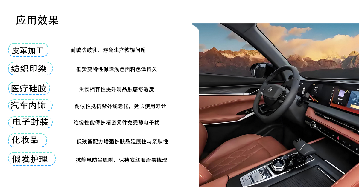 纺织整理;洗发水抗静电;聚氨酯匀泡;合成革手感优化;护肤品乳化稳定;真皮防污整理